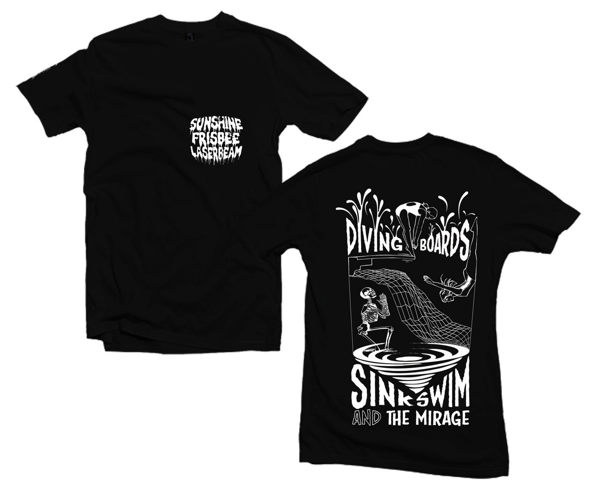 Diving Boards artwork on Gilden Softstyle, Black with White Back print and Breast pocket.